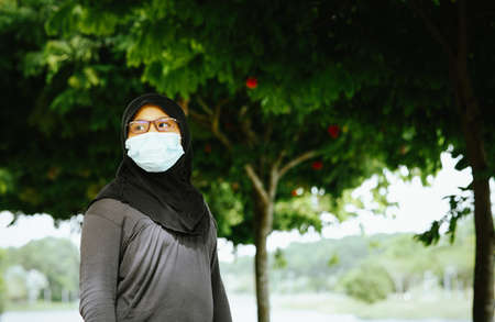 Portrait of young muslim woman wearing glasses and hijab head scarf. Casual islamic girl at the outdoor park.