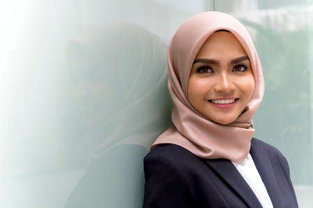 Cute Malay Woman wearing hijab outdoor executive smile to the camera