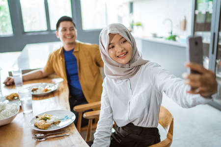 muslim woman taking selfie with her partner while having lunch together