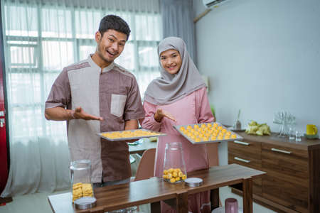 muslim man and woman bake nastar snack for idul fitri