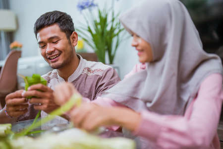 muslim couple asian making ketupat rice cake at home using palm leaf