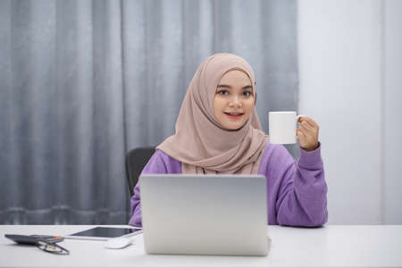 Happy muslim woman brown hijab drinking coffee while working at her home.
