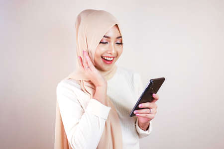 Portrait of young Asian muslim woman get good news on her phone, happy surprised expression