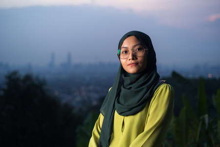 Portrait of young Asian woman during sunset, blue hour at hill view point, Bukit Ampang near Kuala Lumpur. Blurred background