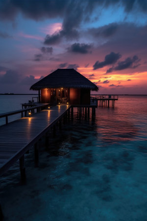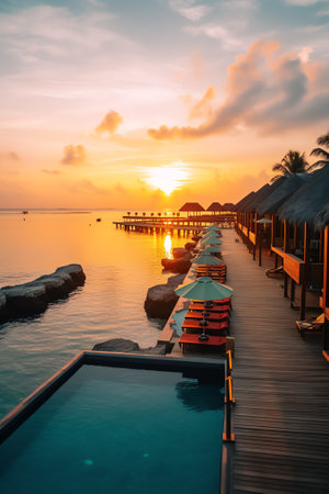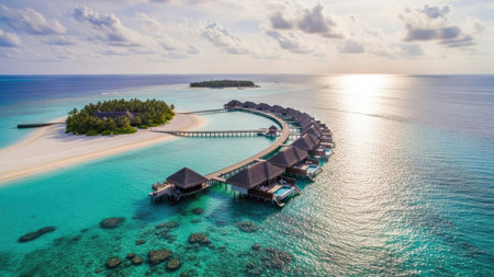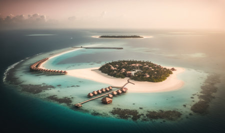 Generative AI : Aerial view of bungalows along the reef at sunset on Baa Atoll Kanifushi Island Maldives