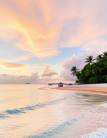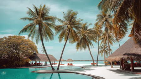 Tropical paradise with palm trees and calm waters offers a serene escape for relaxation and rejuvenation in a stunning coastal environment