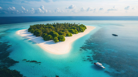 Tranquil summer scene of a tropical island and boat in the ocean, a beautiful getaway, Ai Generated.