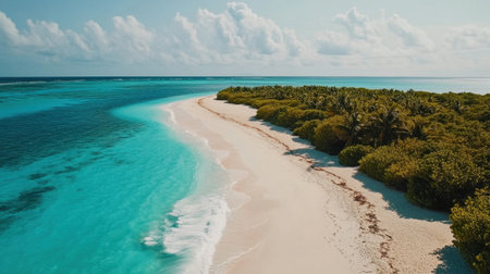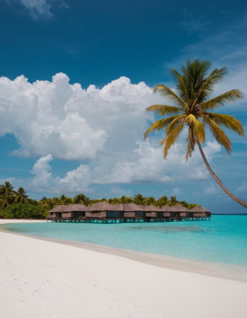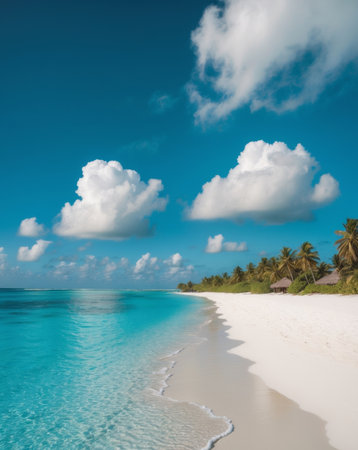 Breathtaking view of pristine white sand beach in Maldives. Turquoise waters of Indian Ocean lap gently at shore, creating serene idyllic scene. Sky is vibrant blue, dotted with fluffy white clouds