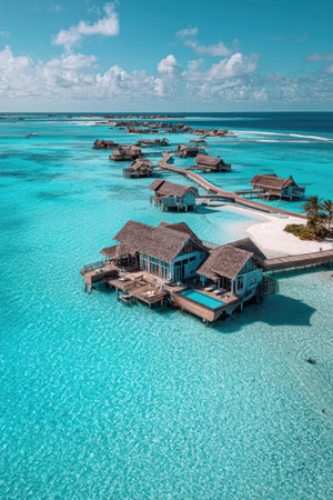 An aerial perspective showcases a collection of overwater bungalows extending into a vibrant turquoise lagoon. The composition is bright, with the structures featuring neutral tones contrasting with the saturated water. The clear sky suggests a sunny day, creating an inviting visual that might be suitable for travel or tourism promotions.