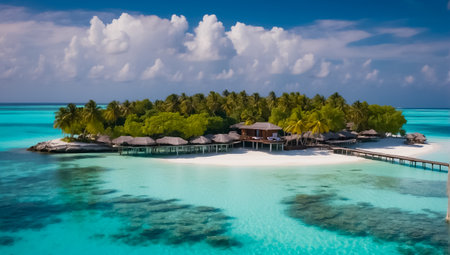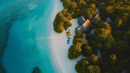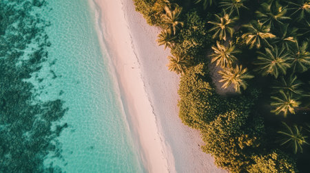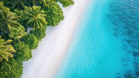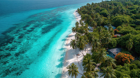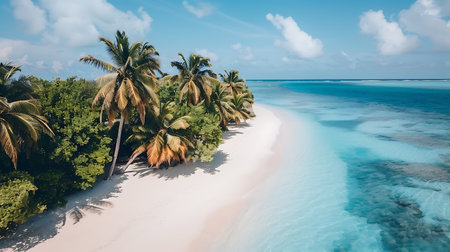 Tranquil aerial view of maldives island beach with palm trees on white sandy shoreline