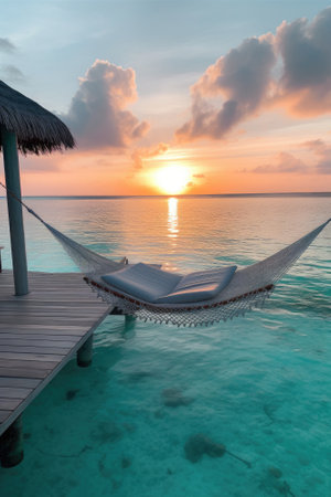 The ocean is calm and the sun is setting, creating a beautiful and serene atmosphere. The water is a deep blue color, and the sky is a mix of pink and orange hues. The scene is peaceful and relaxing