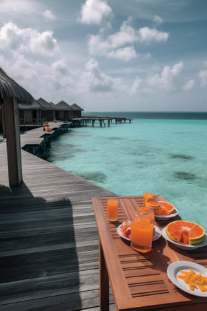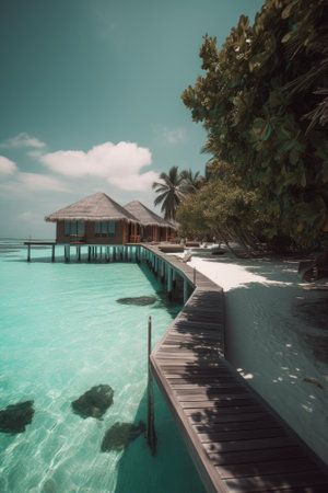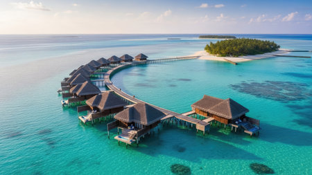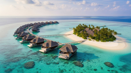 Luxury Tropical Resort with Water Villas and Beautiful Beach Scene. Perfect for travel brochures and websites. Generative AI