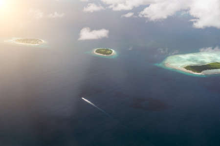 The tropical islands and atolls in Maldives in Indian Ocean from aerial view. Cutting wave boat. Piece of paradise on the Earth. Good choice for vacation. Beautiful top view for wallpaper.