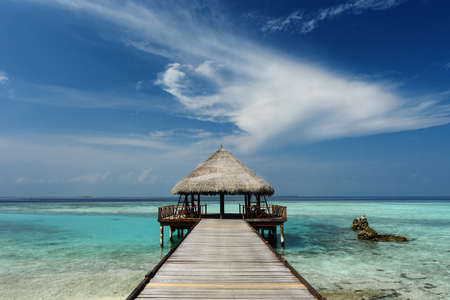 Beautiful tropical Maldives resort hotel and island with beach and sea on sky for holiday vacation background concept - Boost up color Processing