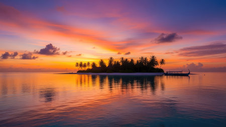 A tropical island at sunset, with a sailboat on the tranquil turquoise ocean reflecting the vibrant pink and orange hues of the sky and clouds.