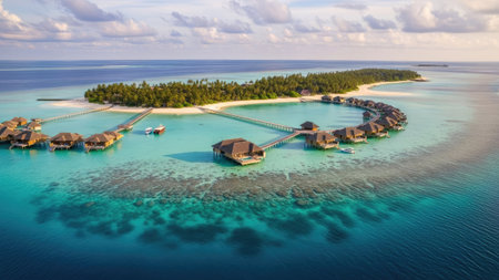 Aerial view of tropical island with water bungalows at Maldives