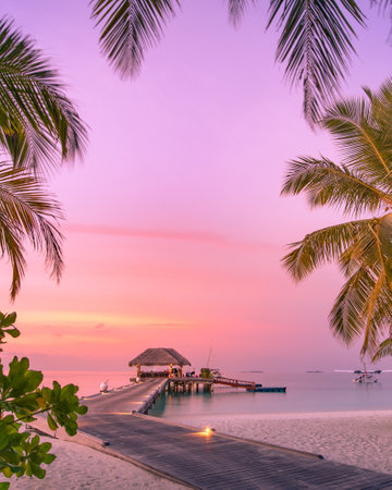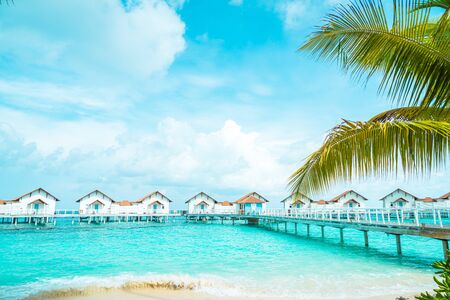 Sunset on Maldives island, luxury water villas resort and wooden pier. Beautiful palm trees leaves with colorful sky and clouds and beach background for summer vacation holiday