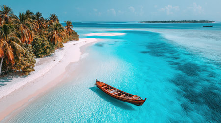 An overhead view reveals a wooden boat resting in crystal-clear turquoise waters, adjacent to a sandy beach. Palm trees line the shore, with deeper blue waters and a distant island visible. The composition, colors, and lighting evoke a sense of tranquility and natural beauty, suitable for diverse commercial applications.