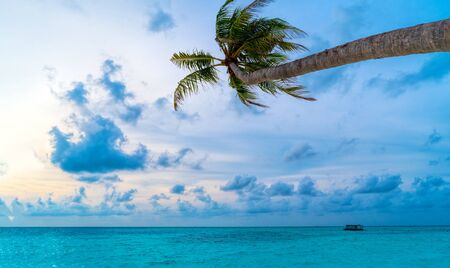 Tropical beach with palm trees and boat at Maldives.
