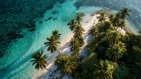 This stunning aerial view captures a tropical island with vibrant palm trees swaying above a pristine white sandy beach, complemented by sparkling turquoise waters.