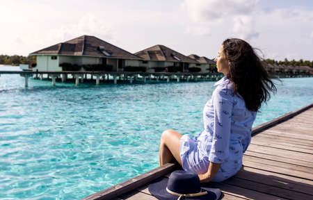 Woman walking on the long pier in Maldives.