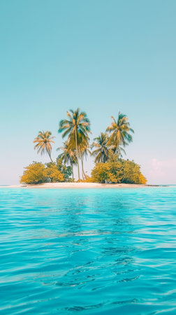 Discover a tranquil tropical island oasis, featuring vibrant palm trees and crystal-clear water surrounded by serenity, ideal for vacation and relaxation themes.