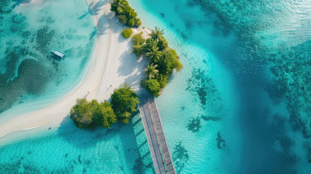 An aerial view of a tropical island showcasing a dock extending into the aqua water leading to a beautiful beach surrounded by lush green trees and natural landscape AIG50