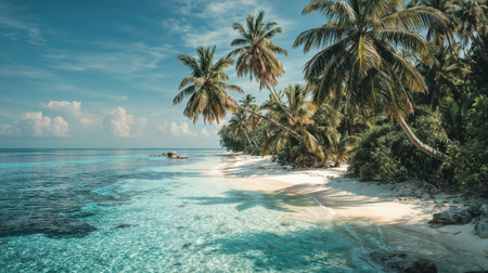 Bright sunlight illuminates a beautiful tropical beach lined with palm trees. Gentle waves lap against the shore creating a relaxing ambiance. This scene captures a peaceful coastal getaway.