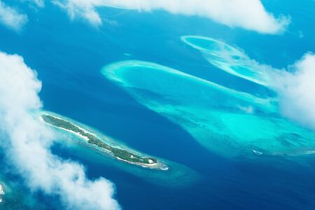 The tropical islands and atolls in Maldives in Indian Ocean from aerial view. Piece of paradise on the Earth. Good choice for vacation. Beautiful top view for wallpaper.