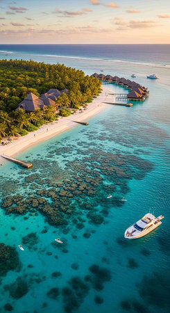 Aerial view of the tropical island with resort. Maldives