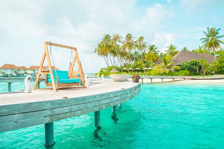 empty sofa swing with tropical Maldives resort and sea background - vintage effect filter
