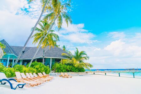 beach chair with tropical Maldives island beach and sea - holiday vacation background concep