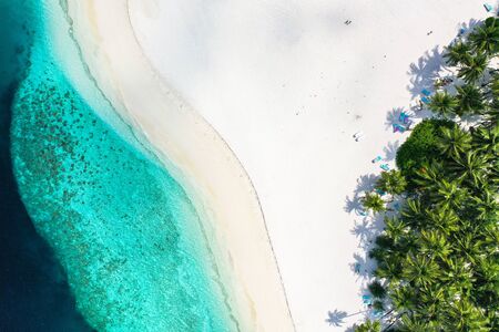 Tropical beach with palm trees and turquoise water. Aerial view