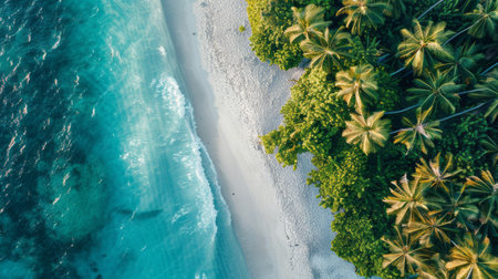 top view of a tropical island, white sandy beaches meeting crystal clear blue waters, palm trees scattered across the shore