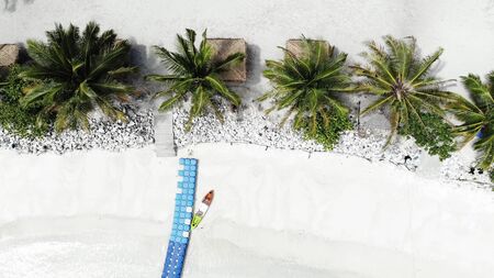 Amazing drone view of the beach and water with beautiful colors. Paradise scenery water villas with amazing sea and beach, tropical nature. summer vacation.