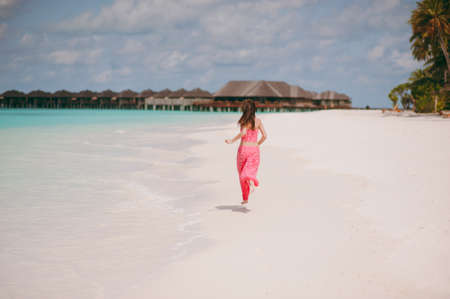 Young girl with long hair in black swinsuit and white shirt in turquoise aqua mint blue water of the ocean in the Maldives