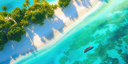 top view of a tropical island, white sandy beaches meeting crystal clear blue waters, palm trees scattered across the shore