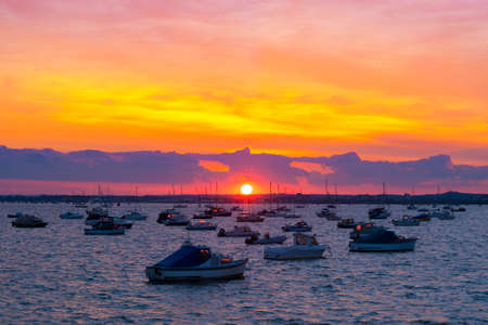 Orange skies over a Dorset harbour with various boats silhouetted on the sea