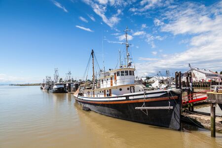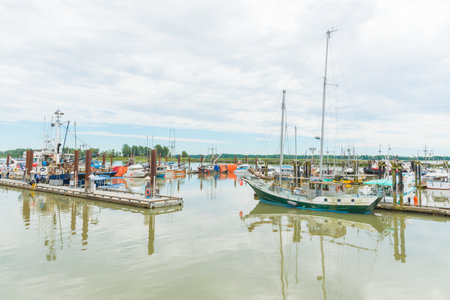 Richmond, British Columbia/Canada - June, 24, 2018: various boats moored at the marina and Fisherman's Wharf in Steveston Village, a popular tourist destination.