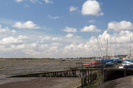 landscape view of maldon docks boats moored across from mudflats with tide out sunny;Essex; England; UK