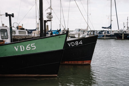 Veolendam, Netherlands - August 08, 2016. Ships moored in the old harbor of Volendam. Volendam is a popular tourist attraction in the Netherlands, well known for its old fishing boats and the traditional clothing still worn by some residents