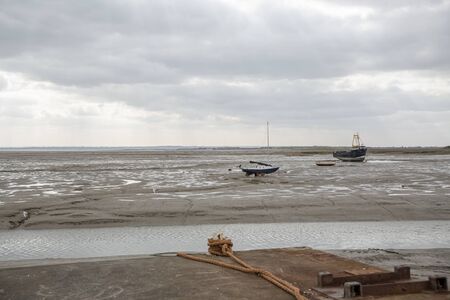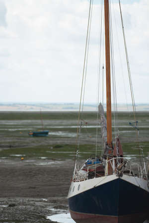 Fisherman boats stuck on the beach in low tide period in Leigh-on-Sea, UK.