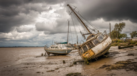 Abandoned sailboats on muddy shore under cloudy sky near riverbank.