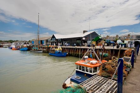 WHITSTABLE, UK - AUGUST 21 2015: Fishing boats and nets made from plastic bottles in Whitstable harbour. Visitors to can also be seen on the dockside. The harbour was built in 1832.