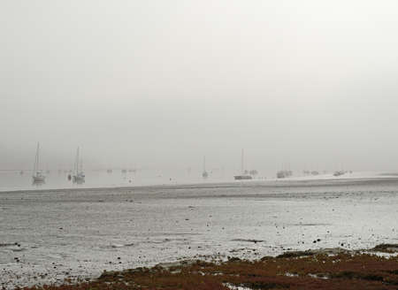 Moored yachts on a river in the mist