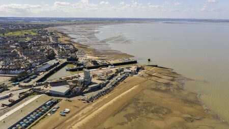 An aerial view of an empty sandy beach. Pandemic quarantine. Whitstable, Kent, UK