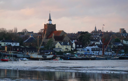 view of maldon across the water from heybridge basin in essex england