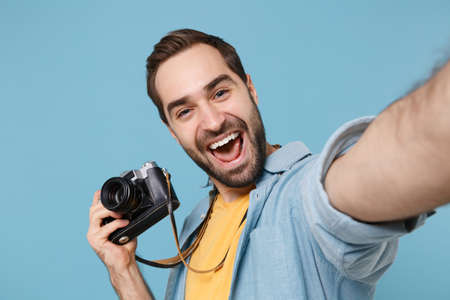 Close up of traveler tourist man in summer clothes isolated on blue background. Male passenger traveling abroad on weekends. Air flight journey. Doing selfie shot on mobile phone, hold photo camera.