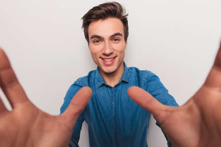 Portrait of handsome caucasian man taking a selfie with smart phone isolated on white background. Young businessman play in application. Look at front.