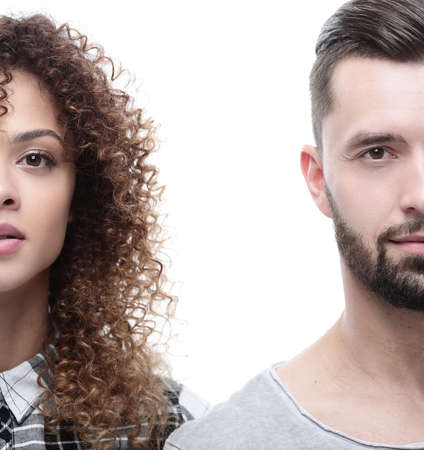 Close-up face of a serious young couple. Photo with copy space